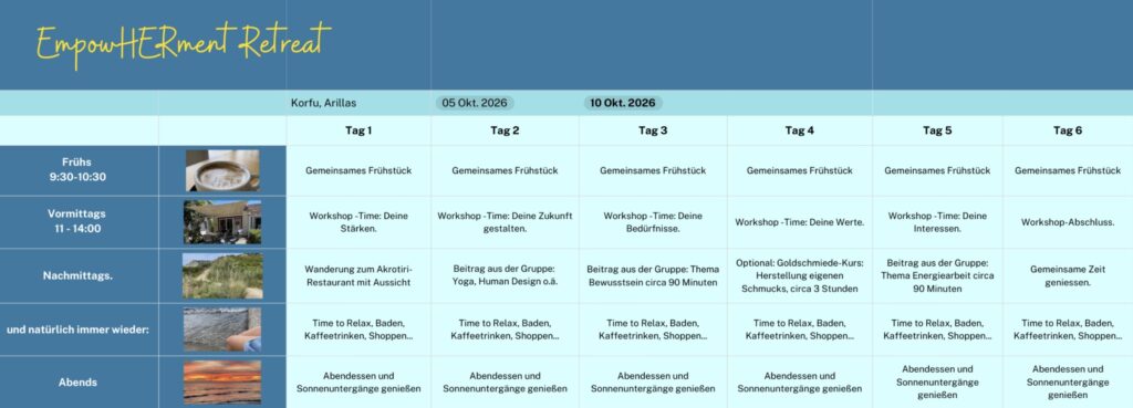 Wir stärken gemeinsam unsere inneren Stärken, finden neue Ideen für eine Zukunft, die uns wirklich entspricht, fassen neuen Mut – tanken die Sonne Korfus und füllen unsere Herzen mit magischen Momenten.